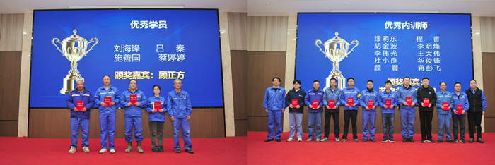在結(jié)業(yè)儀式上,4名優(yōu)秀學員代表分別結(jié)合自身參與的《揚子江造船解決方案》(YSS 2.0)、電子化廠圖等課題,分享了數(shù)字化轉(zhuǎn)型實踐中的經(jīng)驗與感悟。2025年集團內(nèi)訓師全年授課量達732課時,培訓人次超2.5萬,其中安環(huán)條線人均授課17課時,生產(chǎn)條線人均14課時,展現(xiàn)了內(nèi)訓師團隊的強大賦能能力。現(xiàn)場表彰了4名“智改數(shù)轉(zhuǎn)專項優(yōu)秀學員”和10名“優(yōu)秀內(nèi)訓師”,公司領(lǐng)導為獲獎?wù)哳C發(fā)證書及獎金。
