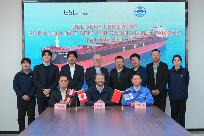 12月18日,船東代表Andrew Lennox先生、我集團副總經理兼揚子三井總經理宋書明先生及揚子三井CFO石丸雄次先生共同簽署“CSL KANATA”輪交船文件。祝愿新船航行平安、滿載順達、一帆風順!