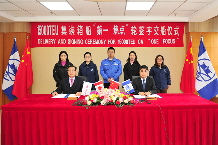 On January 12, under the witness of all parties, Mr. Nan Xiangfu, manager of the new shipbuilding site office of the shipowner SEASPAN Company in our company, and Mr. Du Chengzhong, deputy general manager of our group and general manager of New Yangzi Shipbuilding, signed the ship delivery documents on behalf of both parties.
